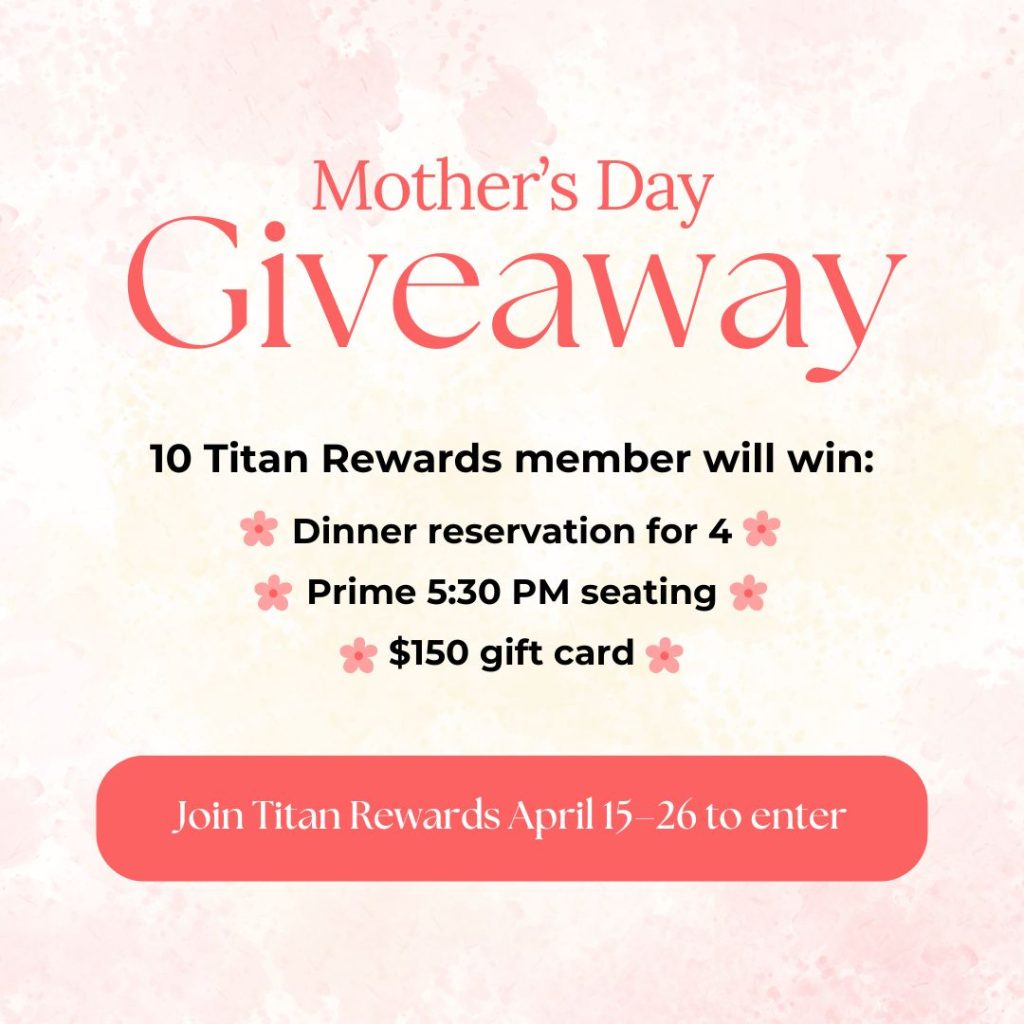Join for free and get 5% back on every purchase at Titan Hospitality restaurants—plus a $10 Welcome Reward just for signing up. Redeem rewards at any location and enjoy exclusive perks every time you dine.